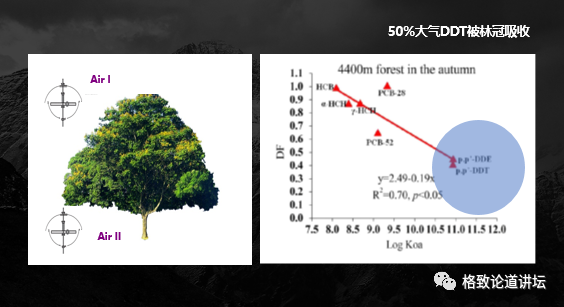 首先,我们爬上树,在树的顶部和里面放了采样器,分别看气流过来的时候,顶部和底部DDT的浓度。我们发现其实50%的DDT已经被树冠吸收了。