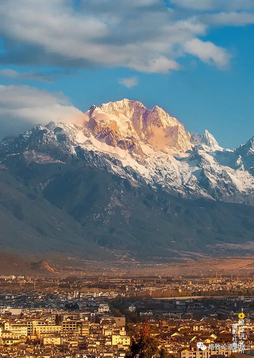 这张很独特的照片一边是海拔5000多米的玉龙雪山,一边是海拔2000多米的丽江古城,高差3000多米却可以同框出现。
