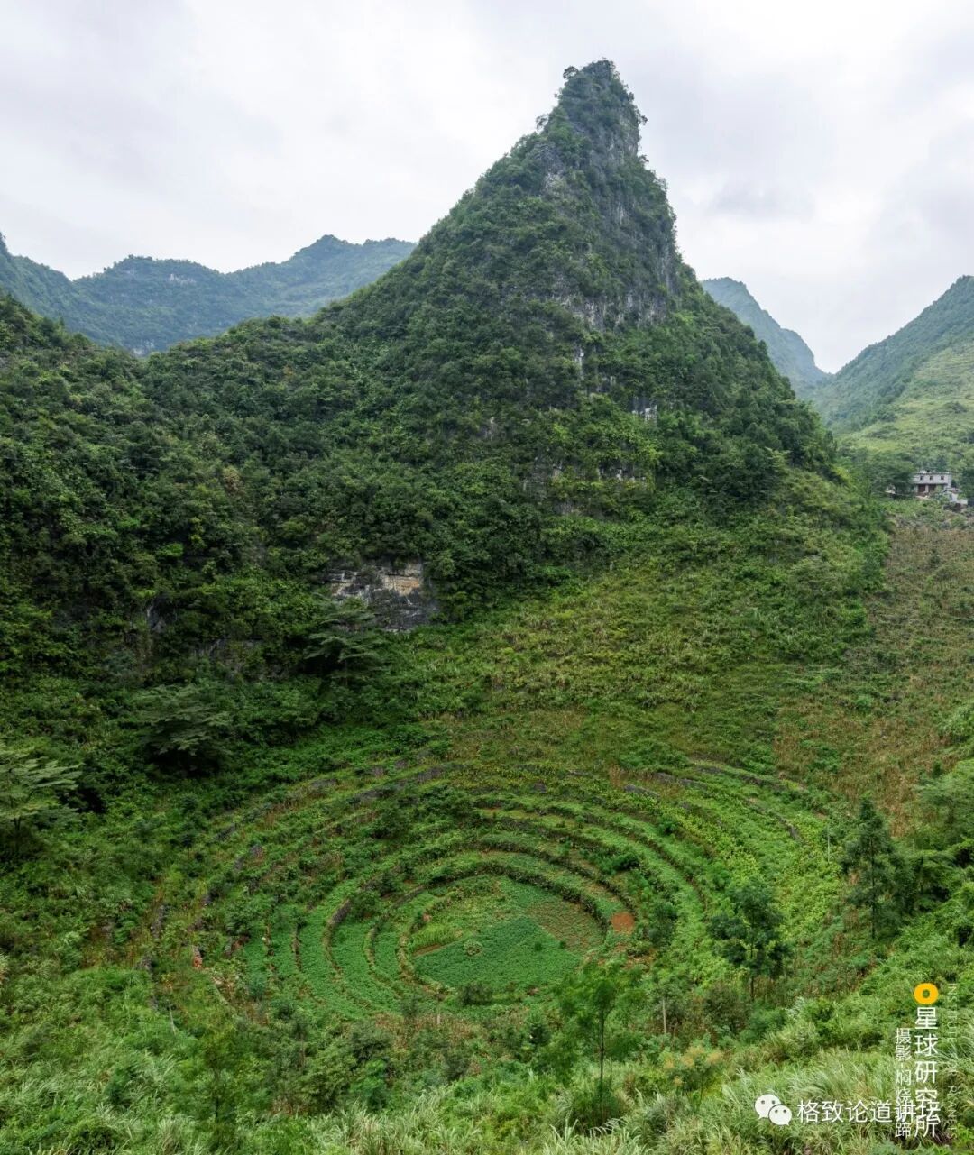这张照片是广西大化县的一个峰丛洼地。这块地方残留了一些耕地,一些土壤,当地人就在这里开垦梯田。一圈一圈的梯田被当地人称之为龙卷地。
