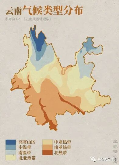 这张图是云南的气候类型分布。云南南北大概900多公里,却有7个气候带、气候区。这样的变化相当于把海南岛一直到黑龙江的气候变化压缩到了一个省里。