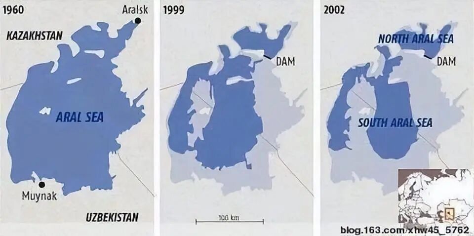 然而随着灌溉使用水源、人口增加、城市化、工业化等使用水源,使得咸海里的水,开始以肉眼可见的速度在下降。
