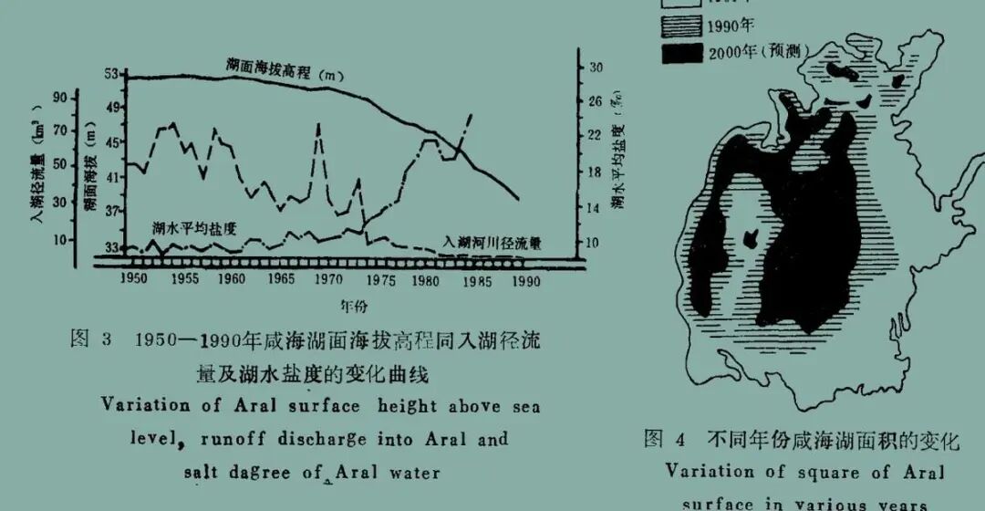 1960年的时候,咸海的水位高程还有53米,到了1987年,则下降到了40.3米。水位的持续下降,不但使得一些浅水区域率先没水了,由于水量的不断蒸发也使得水的盐度进一步增加。