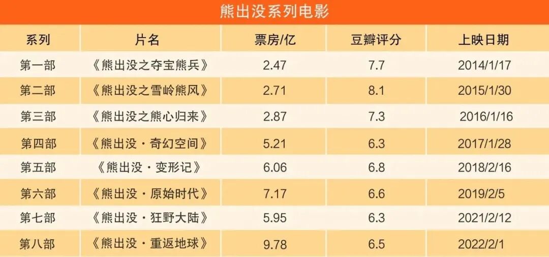 《熊出没》系列动画电影自2014年首次在大银幕亮相,截至2022年底已上映8部,都是在春节档上映,走的是“大开大合”、高成本高票房的大片路子。(注:大片指投资大、制作成本高的电影)