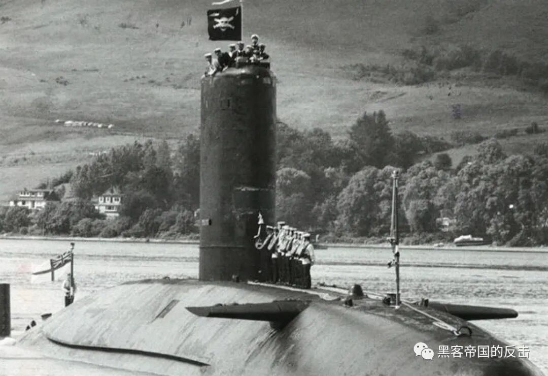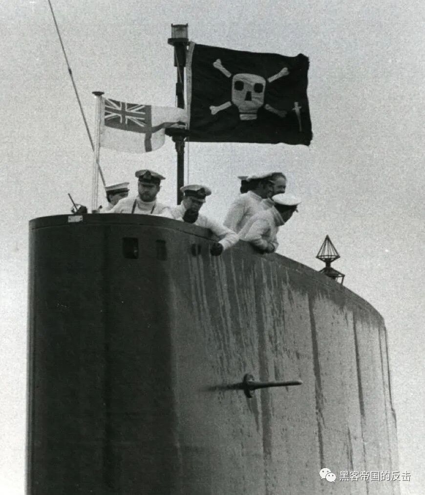 征服者号,英国核潜艇,在福克兰群岛冲突中击沉阿根廷舰艇 "贝尔格拉诺将军 "号后挥舞着 "完成任务 "的海盗旗。