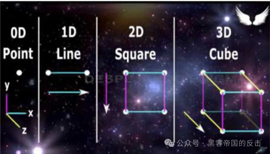 我们有一维,它的特点是意识在这个层面上只是存在,它就在那里,仅此而已。然后是二维。意识是存在的,它只是存在,但它开始感知到有些东西并不属于它自己。理解了这一点,线性就开始了。三维,我们理解了存在,理解了事情的发生,理解了深度。这与一个图形有关: