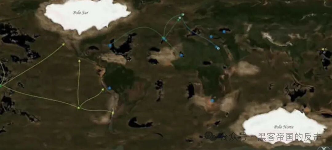 蓝色圆圈代表亚特兰蒂斯文明最重要的聚居地,以及他们的迁移和洪水造成的迁移。蓝色的箭头指向白色的圆圈,中间有一些东西,在今天的吉萨上,这是该地图的后期移动。没有箭头的蓝色圆圈表示亚特兰蒂斯人的居住地,没有移动或迁移路线的记录。