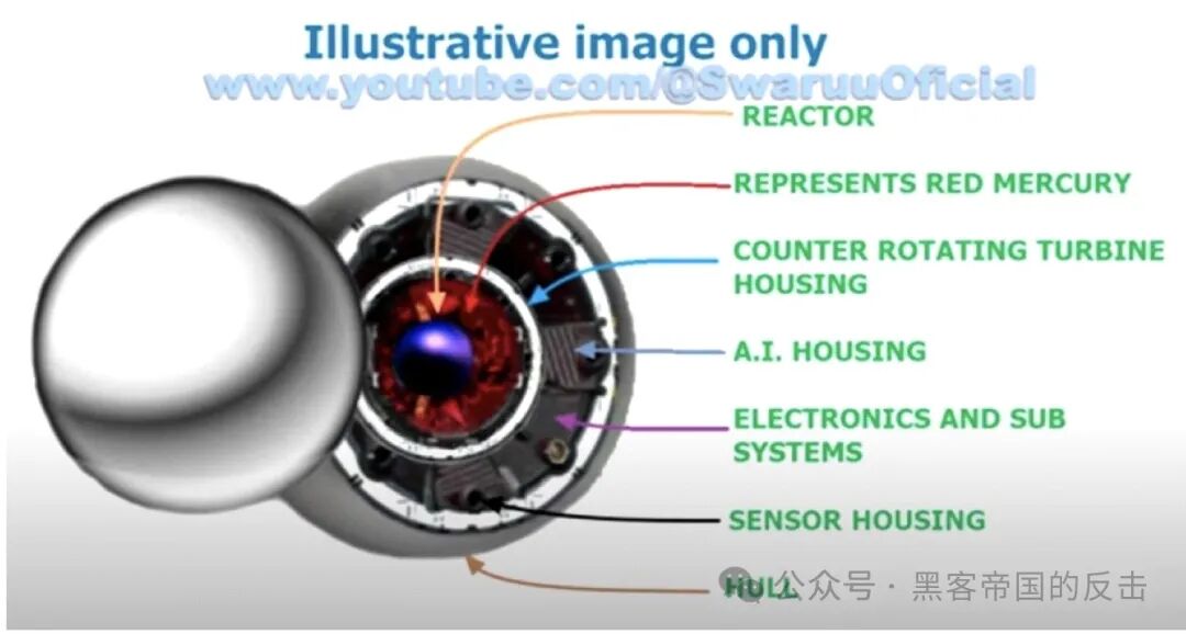 接下来,由内而外描述的是旋转涡轮控制系统,然后是反向旋转的球形涡轮,它使用一种基于富集汞的超导流体,与 "红汞"类似,但并不完全相同。
