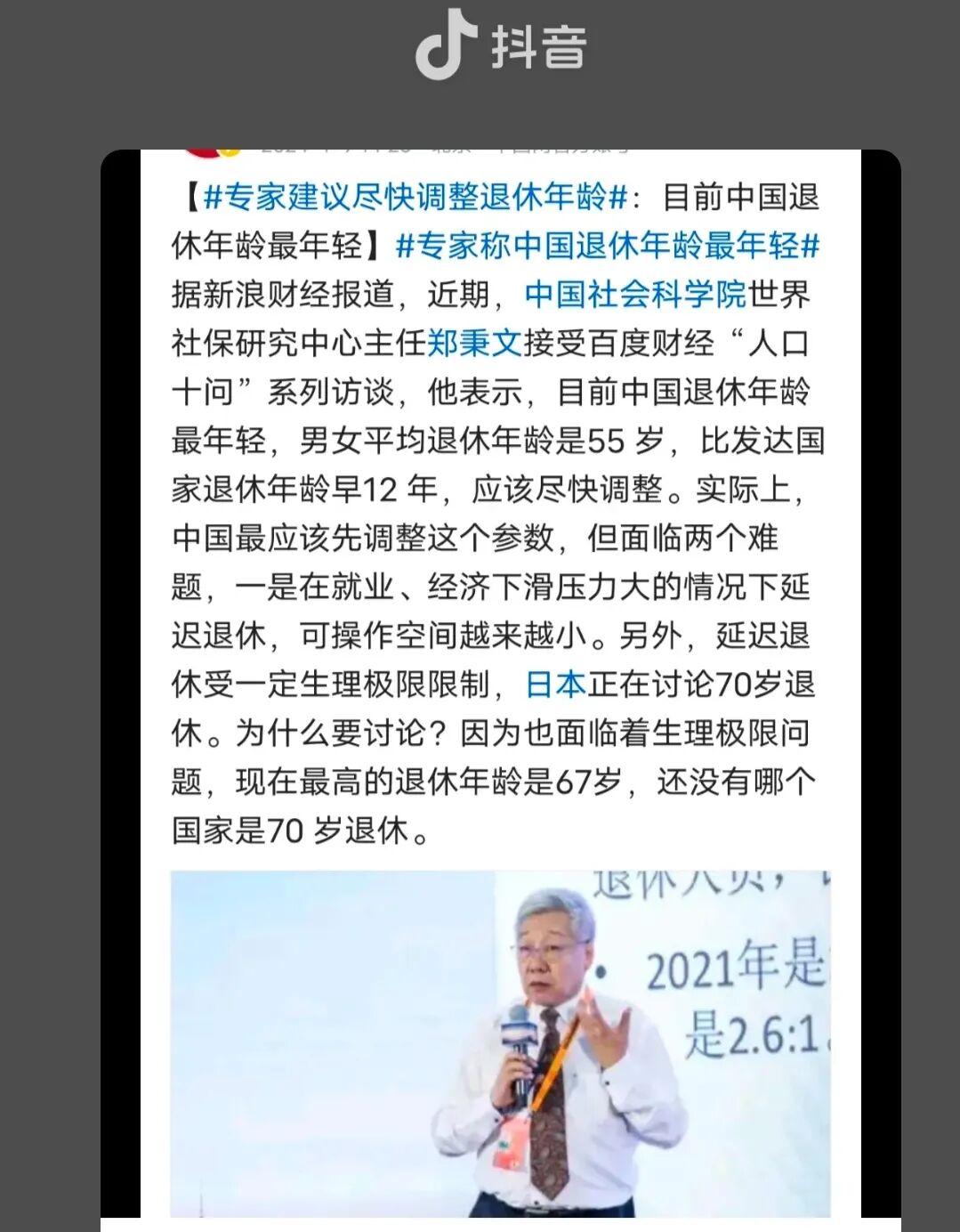 小禅平时很少刷抖音,今天偶尔一刷,竟然刷到了一则视频:中国社会科学院专家郑秉文说的一句话,他说:中国退休年龄最年轻,比发达国家退休年龄早12年,应该尽快调整。