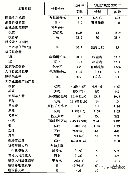 “八五”计划完成情况列表而在基础公共设施建设上,三峡、小浪底这些大型水利枢纽成功通过论证,开始开工建设。铁路方面也基本建成京九、宝中、集通新线和兰新复线,为后续我国经济发展提供更为畅通的运输动脉。然而,“八五”计划虽然取得了很大的成就,但之前一直困扰着中国经济的经济“过热”问题一直存在,“八五”后三年物价指数连续三年突破两位数,1994年居民消费价格指数高达24%,接近恶性通货膨胀,固定资产投资建成投产率仅仅只在60%左右,创历史新低。“八五”计划在取得喜人结果的同时,也存在着高增长、高投资、高通货膨胀、低效益的隐患。而这个隐患,会被国家如何解决呢?控制“过热”,“九五”生活新飞跃1996年3月,全国人大八届四次会议讨论和通过“九五”计划纲要草案。“九五”计划纲要提出,在经济发展上,要实行从两个根本性转变:一是经济体制从传统的计划经济体制向社会主义市场经济体制转变;二是经济增长方式从粗放型向集约型转变。而要实现这些预期目标,控制好经济“过热”问题,以此为经济体制的成功转变提供良好稳定的经济环境,是政府的首要经济任务。为此,在整个“九五”计划内,国家严格控制货币供应量,M2(流通于银行体系之外的现金加上企业存款、居民储蓄存款以及其他存款)与“八五”计划相比大幅下降,降低约15个百分点。消费价格指数也由“八五”平均的12.9%,降低到1.8%,中国经济在1997年成功地实现了“软着陆”,终于遏制住了多年的经济“过热”问题。而在遏制经济“过热”问题之外,整个“九五”期间的国民经济在历经了重重国内外困难后,依旧取得了极大的发展。在1997年抑制住经济“过热”问题后,1998年来自国际的亚洲金融风暴又紧接着来袭。在外部经济危机冲击与国内经济需求相对不足的严峻经济背景下,政府果断地实施积极的财政政策和稳健的货币政策,努力扩大内需,增加出口,保持了经济持续增长,避免了大起大落。在中央的有力宏观调控下,过去困扰中国人许久的商品短缺现象基本被消灭,工农业主要产品产量也超额完成了计划,许多产品的产量甚至还位居世界前列,特别在是物价得以降低的情况下,人民的生活条件有了较大的改善,以电视机为代表的家电越发普及到每一个老百姓的家庭之中,为那时候的生活增添了无数欢笑与喜悦。“九五”计划之后,我国又于2001年12月加入世界贸易组织。自此,中国的经济发展与国际市场融合得越发紧密,外资落地投资数额不断增多,对外贸易源源不断地为中国经济发展注入动力,中国就此在信心百倍之中踏入了21世纪,迎来了经济高速增长的黄金20年。