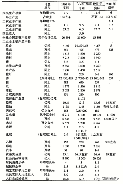 而除去国内经济问题,当时中国的外部国际环境也极为严峻,东欧解体已经开始,曾经不可一世的苏维埃巨人此时已经遥遥欲坠。在国家经济面临巨大挑战,国际环境危机四伏之时,一位老人撑起了这副引领国家迈出困境的重担。1990年12月,中共十三届七中全会提出了“八五”计划的建议,而一年之后,国务院总理李鹏又再次阐述了经济发展计划中要求国民经济持续、稳定、协调发展的方针。而在“八五”计划执行一年后,邓小平南巡讲话,提出了要继续进一步改革,这样子下来,“八五”计划期间的中国经济又加上了一副重担——由计划经济正式转轨到市场经济。此时中国政府在经济方面的任务很重,但在中国无数劳动者的辛勤努力下,以及领导人和政府部门的有力决策下,顺着经济改革开放这个大好契机,“八五”期间内,中国经济总体上取得了很大的成绩,继1988年经济总量比1980年翻一倍后,1995年经济总量又再次比1988年翻一番,国民生产总值达到了5.76万亿元。而以更为微观的视角进行研究,也可以发现,各类细分领域大都取得了亮眼的成绩。最为关键,最关系到国计民生的粮棉油肉等农产品,创下了当时的历史最高纪录,以纱、化纤、纸为代表的轻工业品超额完成了“八五”计划内的指标,煤电油这一系列工业发展必不可缺的能源产量大幅度增长,而标志性工业产品——钢的产量更是突破9500多万吨,提前五年就超额完成了十年规划里2000年的指标8000万。