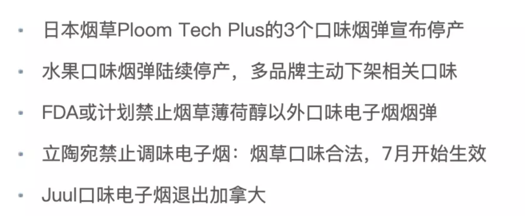 2020年2月美国食品和药物管理局就曾出台针对调味电子烟新规禁令,禁止除烟草和薄荷醇以外的调味换弹电子烟生产销售。