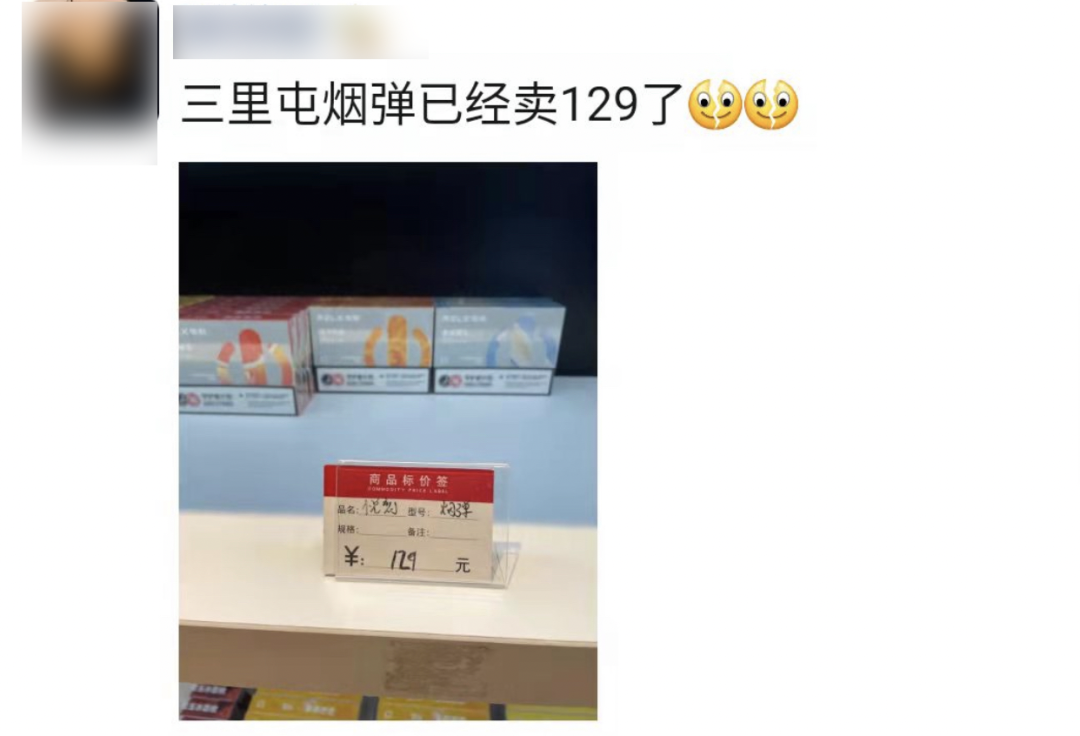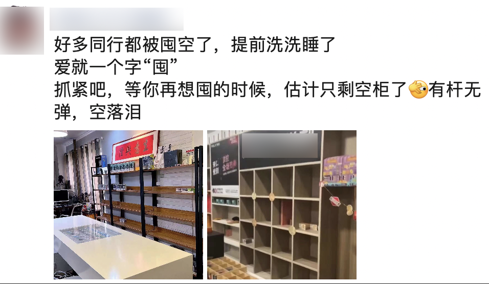 部门线下店铺货架上的烟弹被烟民们抢购一空,门口贴出了售罄提示。