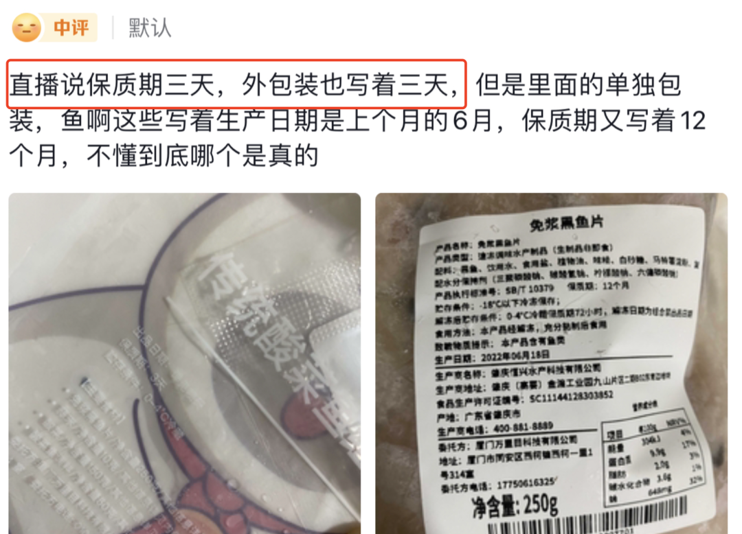 有购买了预制菜的消费者表示在预制菜外包装写着3天保质期,内包装上则写着保质期12个月,被质疑在保质期的问题上打了虚假宣传的擦边球。