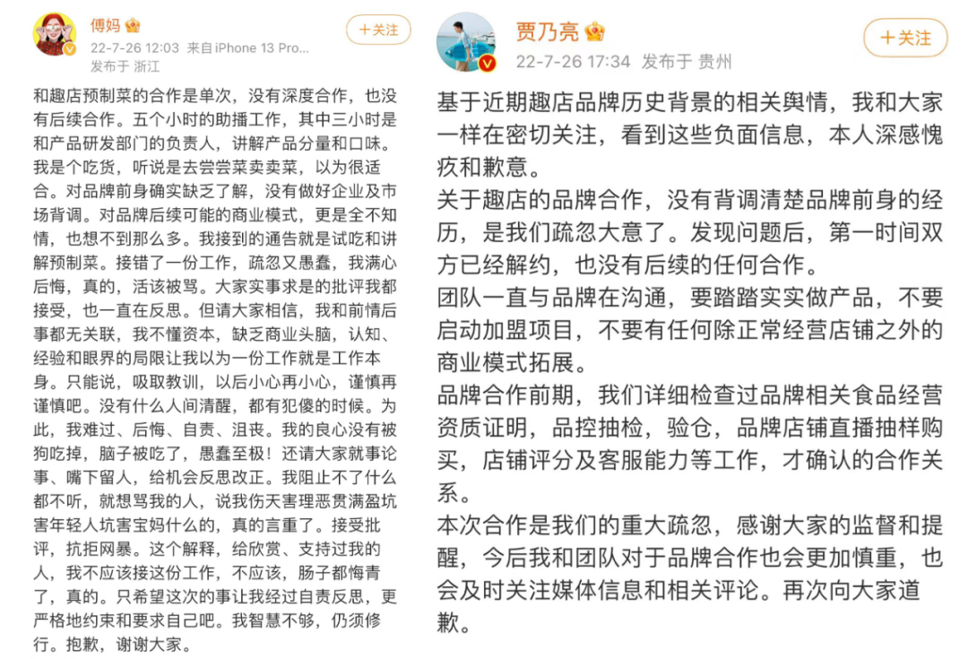7月26日,傅首尔道歉称:“自己接错了一份工作,疏忽又愚蠢”,和趣店预制菜的合作是单次,没有深度合作,也没有后续合作。