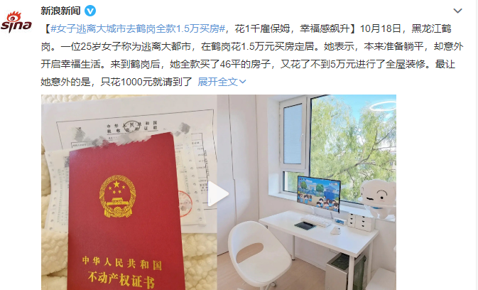 “25岁女孩逃离大城市,1.5万买下46平方米的房子,每月花1000元请阿姨给自己做饭,完成幸福移居。”