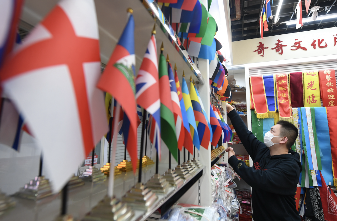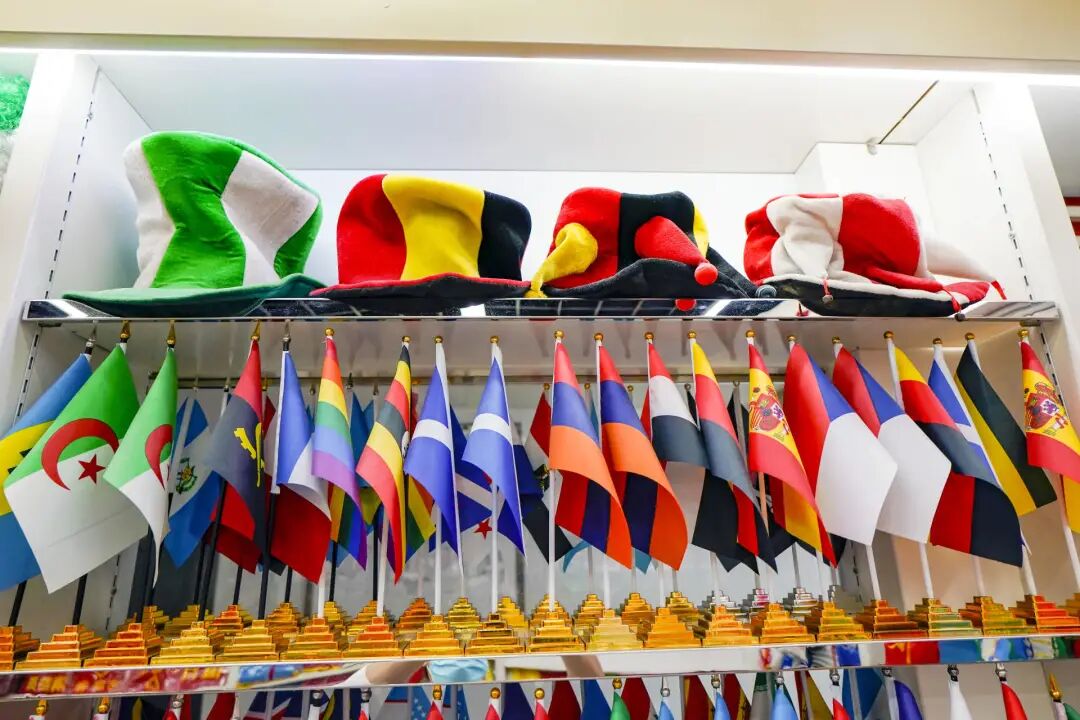 走进浙江义乌国际商贸城三区,商场道路两侧的体育用品店铺橱窗上,挂满了球衣、助威旗帜和贴纸等世界杯元素商品。