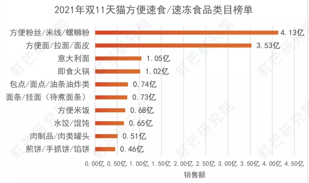 在2021年双十一天猫方便速食/速冻食品类目销售榜单中,酸辣粉更是和螺蛳粉、方便粉丝一起坐上了销量头把交椅。