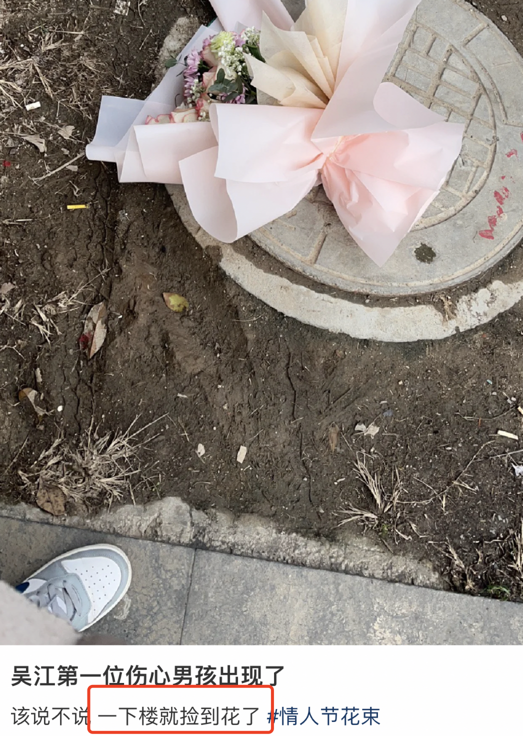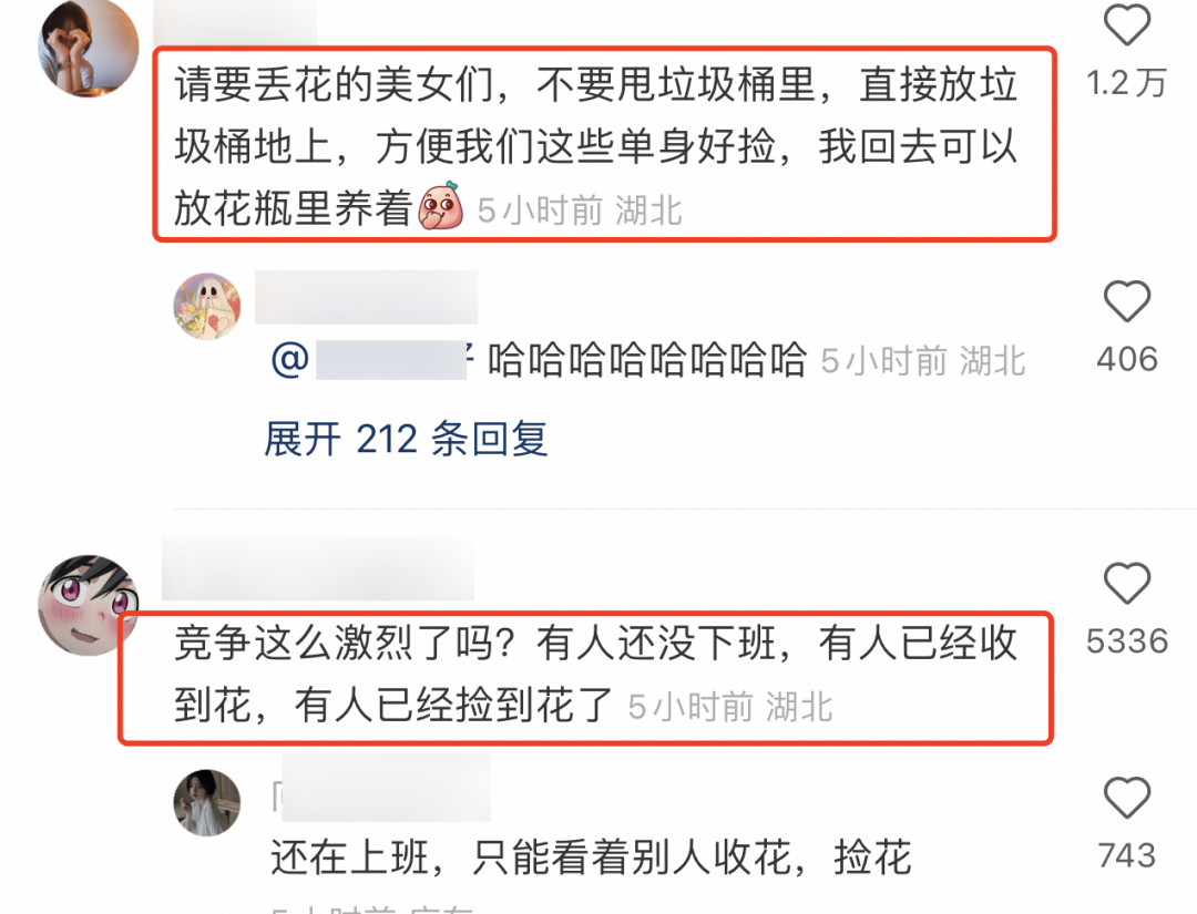 有网友自嘲说:“请丢花的美女们,不要甩在垃圾桶里,直接放垃圾桶地上,方便我们这些单身的好捡,我回去可以放花瓶里养着。”