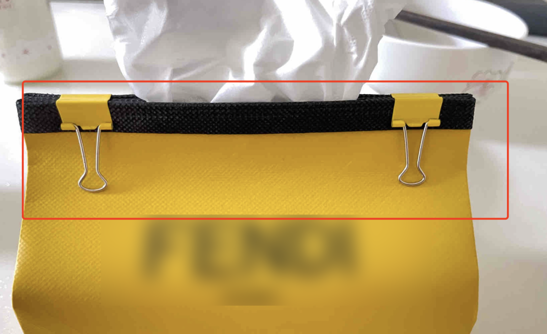 在袋子侧面开口,简单加工几下,装上餐巾纸做成纸巾盒。