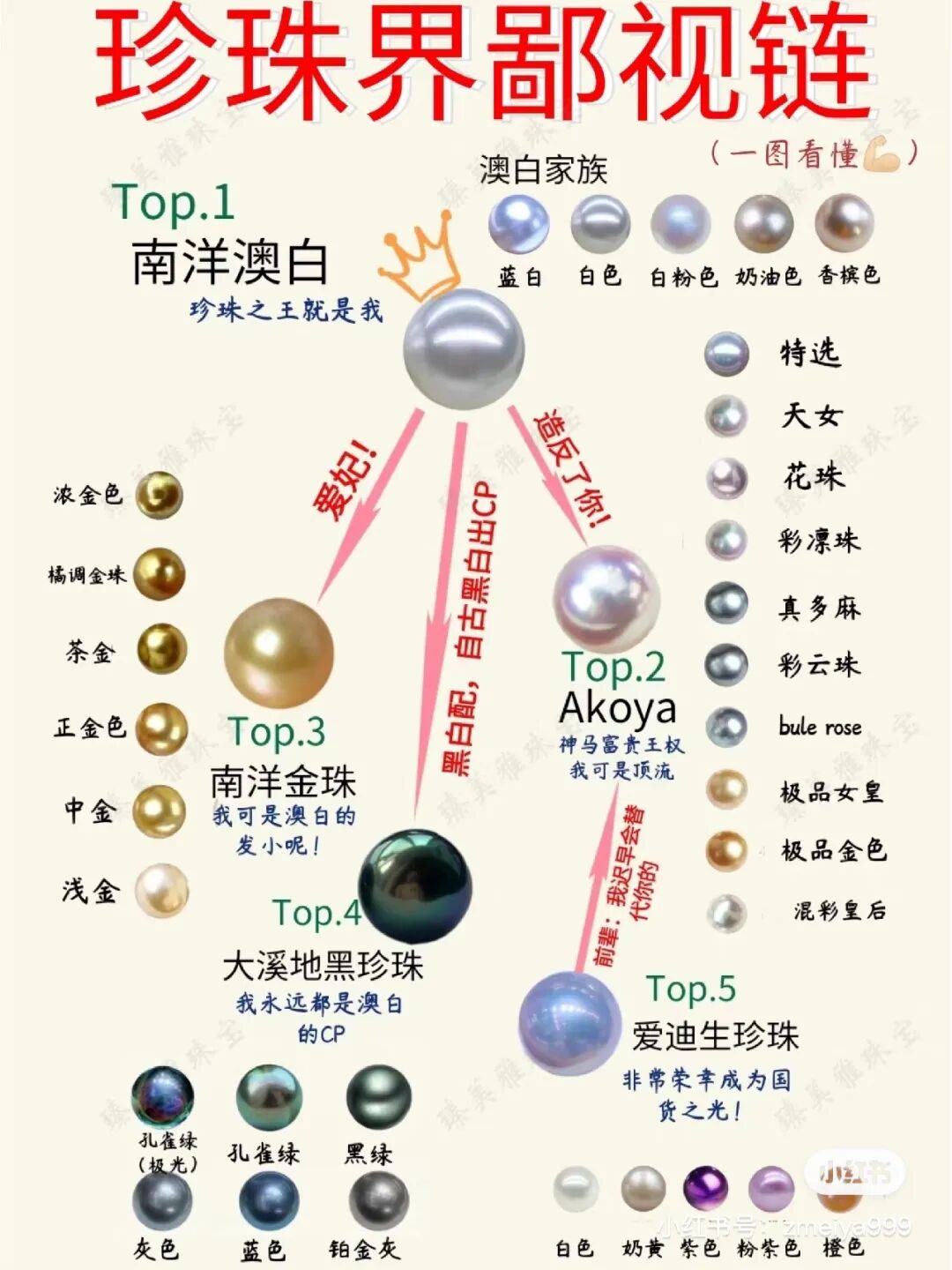 海水珠:早期主要以日本培育的akoya为代表,根据产地不同划分成大溪地、南洋金珠、澳白等品类。