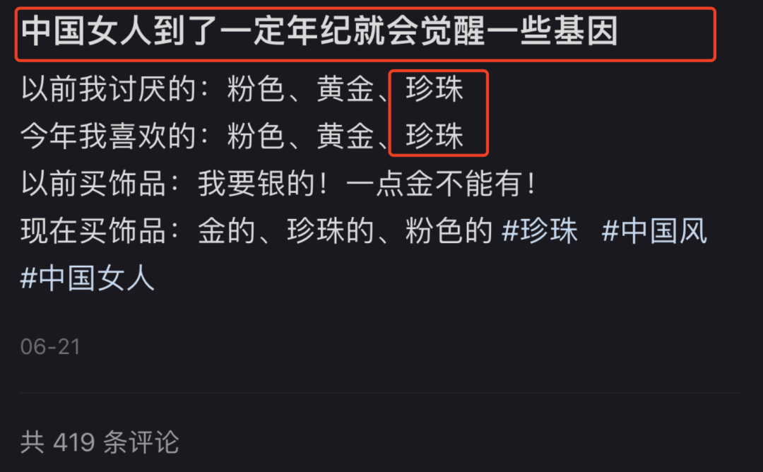 社交媒体上开始流传这样一种说法,中国女人到一定年纪就会觉醒喜欢珍珠。