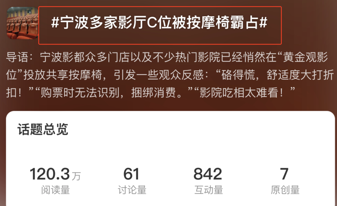 这样的现象不在少数,几天前,浙江宁波多家影院也因为将中心黄金位置改造成按摩椅登上热搜。