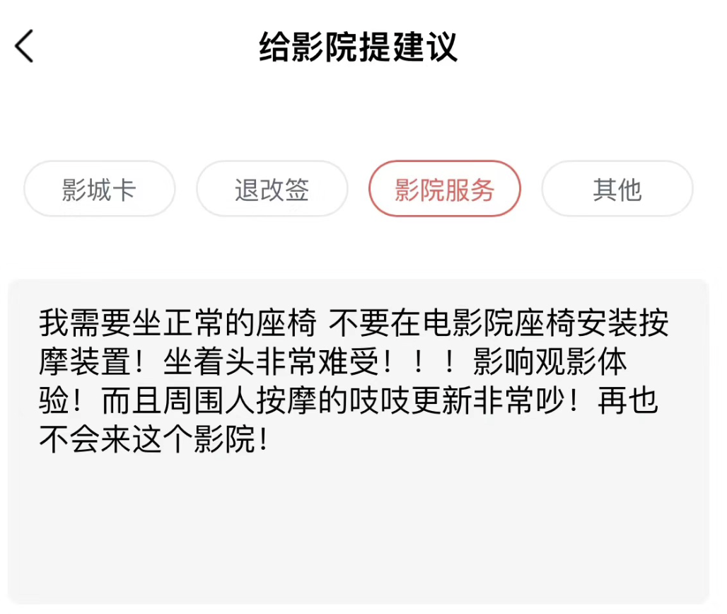 “另一个不合理的点在于这种服务只要坐下就会启动,但凡你想坐自己的位置,就不得不忍受两分钟按摩,周围人按摩会发出机械振动的噪音,整场电影心情都非常烦躁,我只能转身去边上的空座位。”