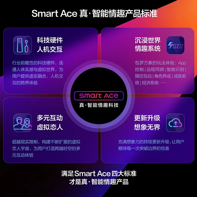从科技硬件、情趣系统、虚拟恋人、更新升级等四大维度,重新框定智能情趣产品的概念标准。用户在选购情趣产品时,认准Smart Ace标准,就能选到真正能打的好产品。