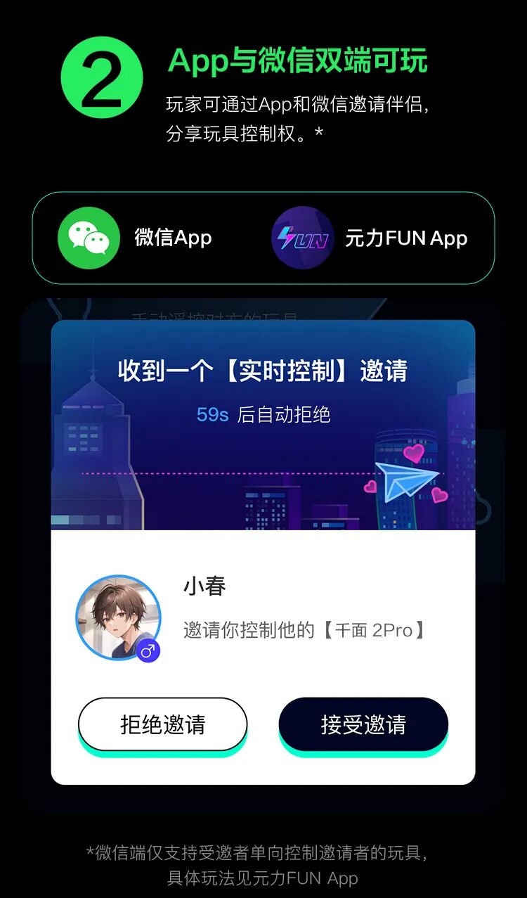 当然,也有十分简单快捷的互动,比如直接通过微信直接邀请对方控制你的玩具。有了它,异地恋人就可以在微信视频、聊天互动的同时,实现身体上的交流了!
