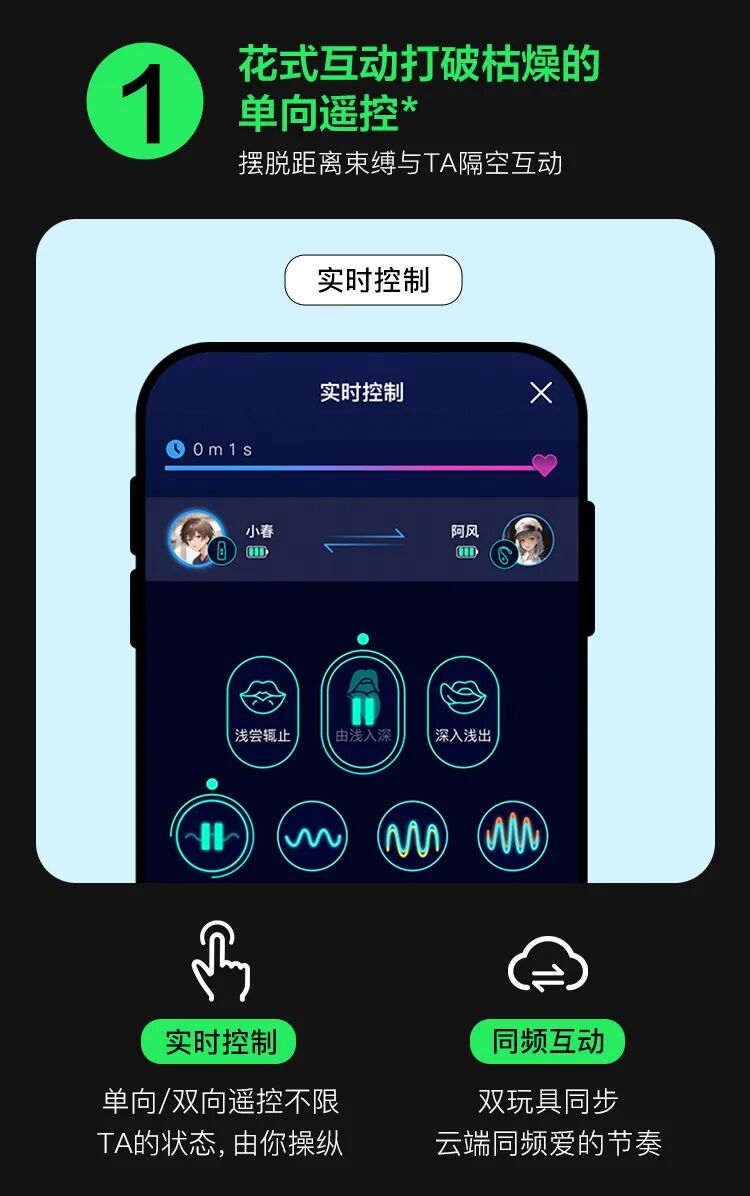 不仅可通过元力FUN App互相遥控对方的玩具;还能让双方玩具远程智能互感、保持力度和刺激体验上的同频,让双方“爱的体验”节奏一致,堪称异地恋人实现深度play的大杀器;