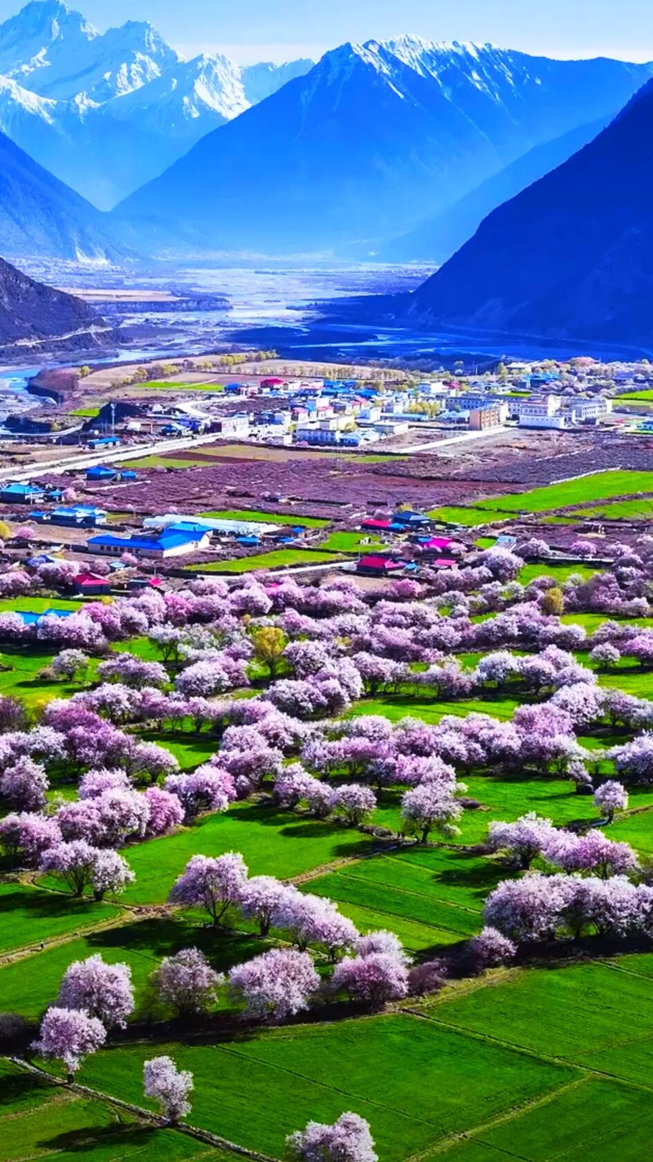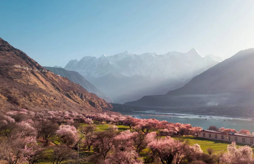 这里的桃林大多沿雅鲁藏布江而生,雪山、江水、青稞地与粉红的桃花共同构成一幅绝美画作。