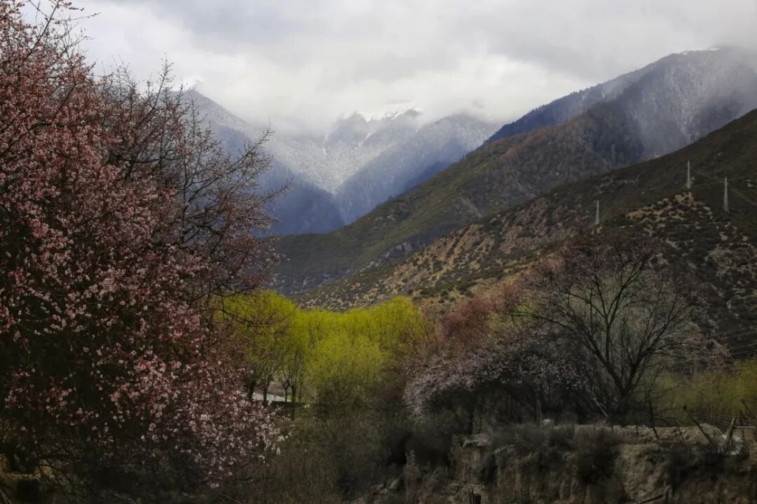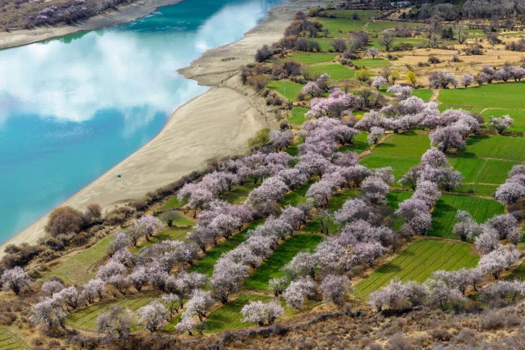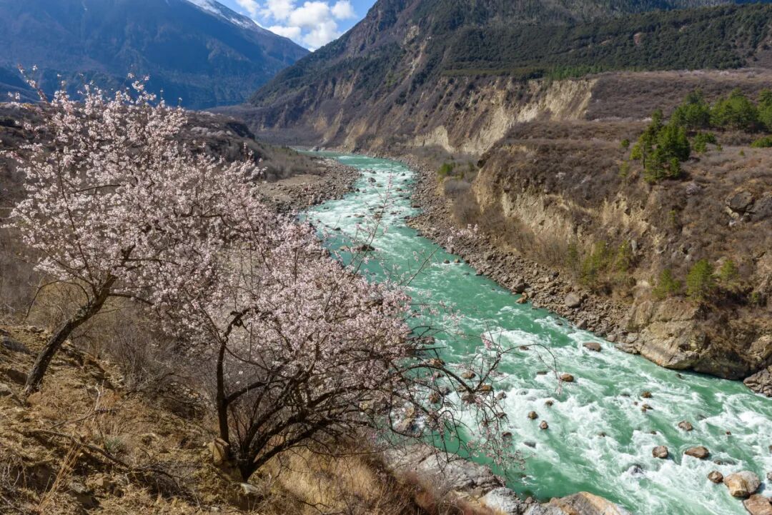 雅鲁藏布江两侧,错落有致的桃花林,映着雅江之水,散布在各个村庄、雪域高原的桃花林也正慢慢开放。