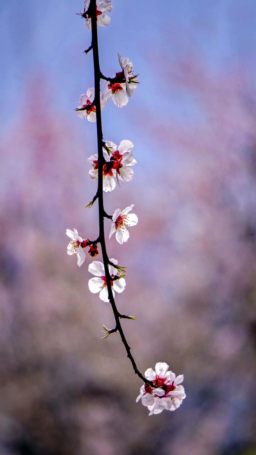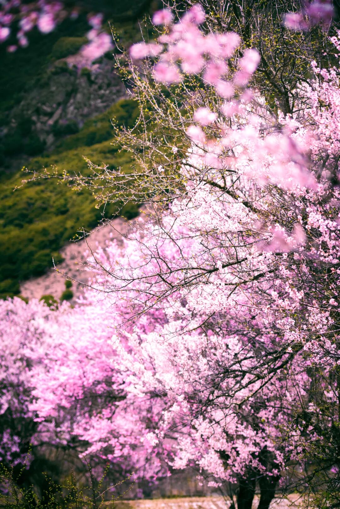 苍穹美,没有江南桃花的含蓄美,因为这是一片野生的桃花,野桃树干粗大而遒劲,漫山遍野粉色桃花与青山,一颗颗桃树漫山遍野、肆意灿烂的开放着。