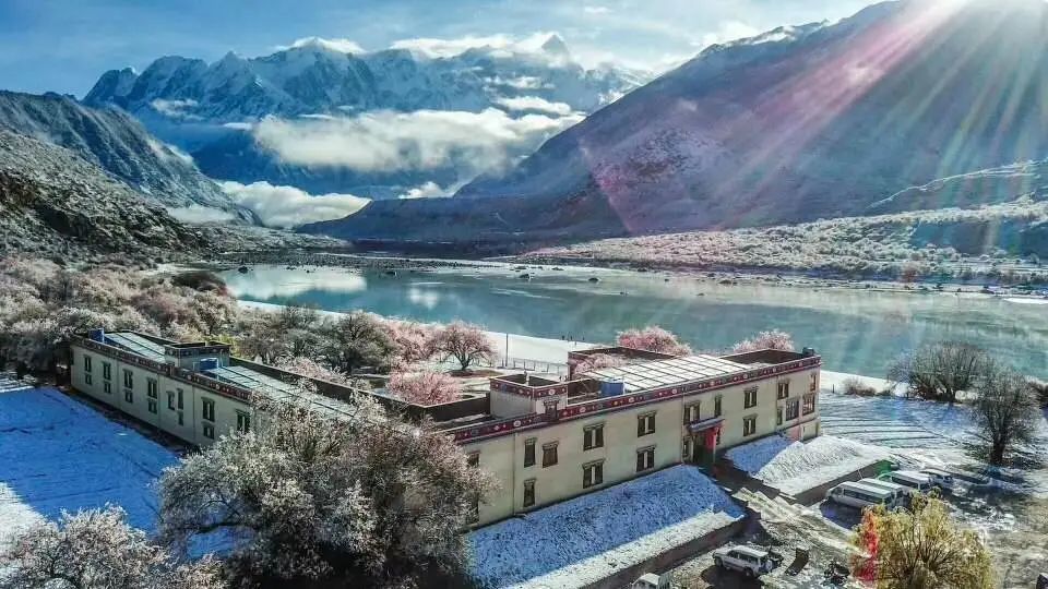 柔媚美,粉嫩的桃花,在气势磅礴的雪山怀抱中无限柔媚。繁花似锦的野桃林,映衬着湛蓝天空洁白雪峰与碧玉般的河水,美不胜收。