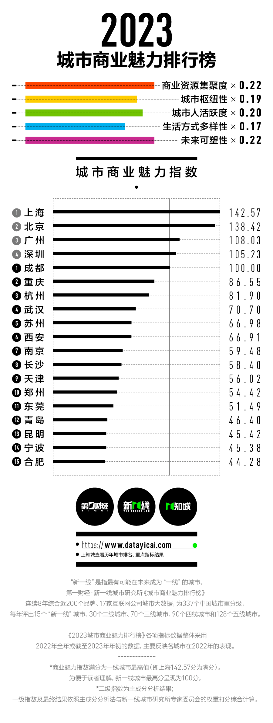 5月30日,第一财经旗下城市数据研究项目新一线城市研究所在上海发布《2023城市商业魅力排行榜》。中国内地337座地级及以上城市纳入榜单评估。