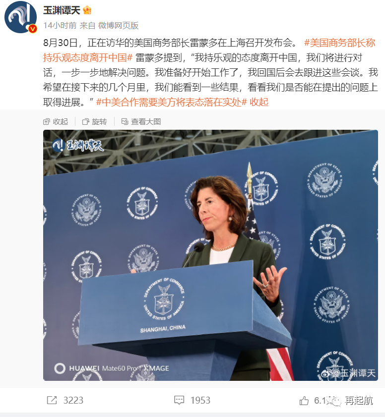 华为,这一次也是用了同样的方式,狠狠地打了美国的脸。因为,就在华为发布新机Mate 60 Pro的时候,美国商务部长雷蒙多正在访华。这一个耳光,打得简直太响了!在占豪看来,美国对华为制裁得有多狠,华为这次耳光打得就有多响!