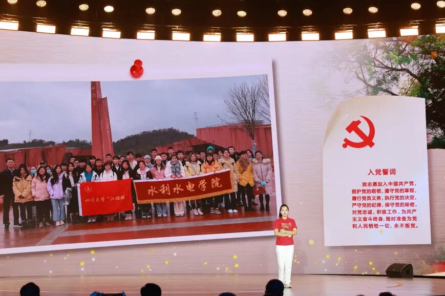“锦水含章”篇章以歌曲《红梅赞》引入,川大人走上舞台,结合工作学习实践,动情讲述传承江姐精神矢志报国、援外抗疫展现大爱、创新赋能文博考古故事,生动诠释习近平总书记倡导的红色传承、文脉赓续、人民至上。