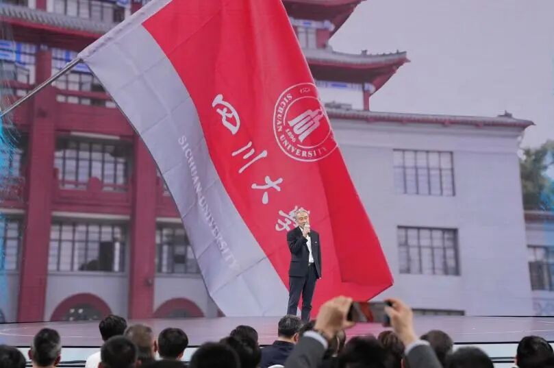 伴随悠长琴音,四川大学校长汪劲松徐徐开讲。他用川大校旗的三种颜色,引出一代代优秀川大青年的奋斗故事,讲述着川大人的三种担当。“锦锈红”,是川大青年赓续红色血脉、忠诚许国的象征;“优雅灰”,是川大青年淡泊名利、科研报国的象征;“纯洁白”是川大青年白衣执甲、逆行而上守护家园的象征。回望历史,正是这群优秀青年汇聚大学“求学问道”,又从大学起航,投身民族复兴伟业,以青春“小我”书写强国“大我”。汪校长勉励当代青年:“用青春和汗水创造出让世界刮目相看的新奇迹!”