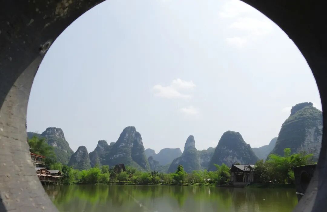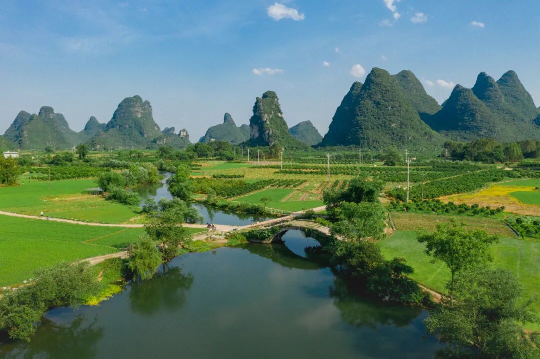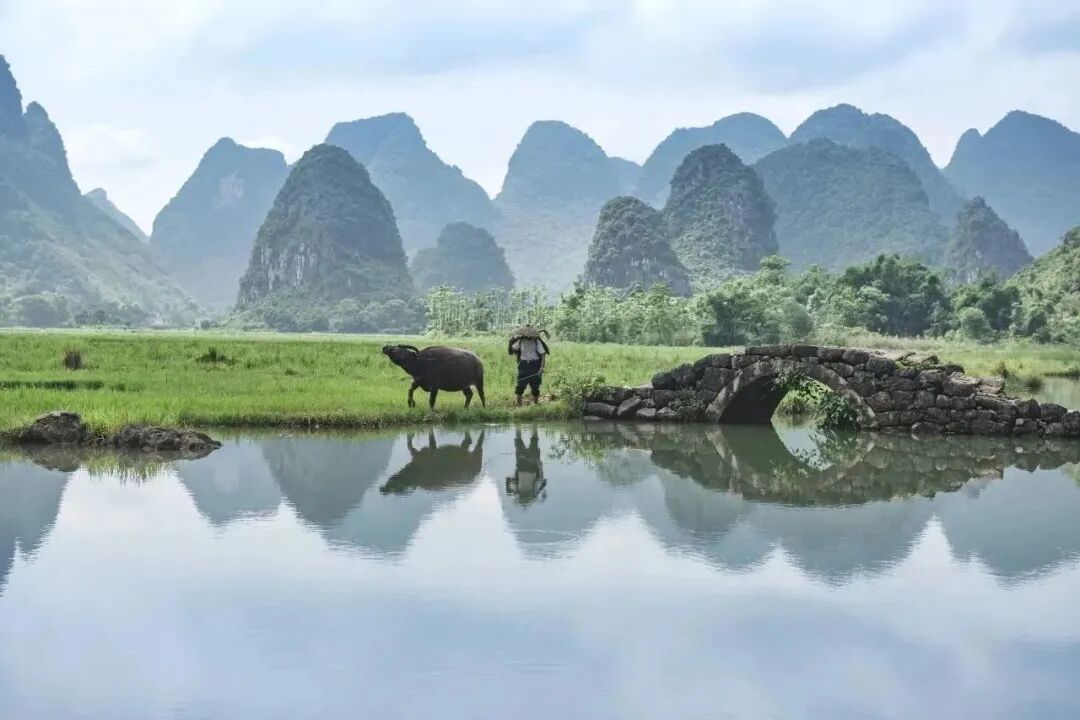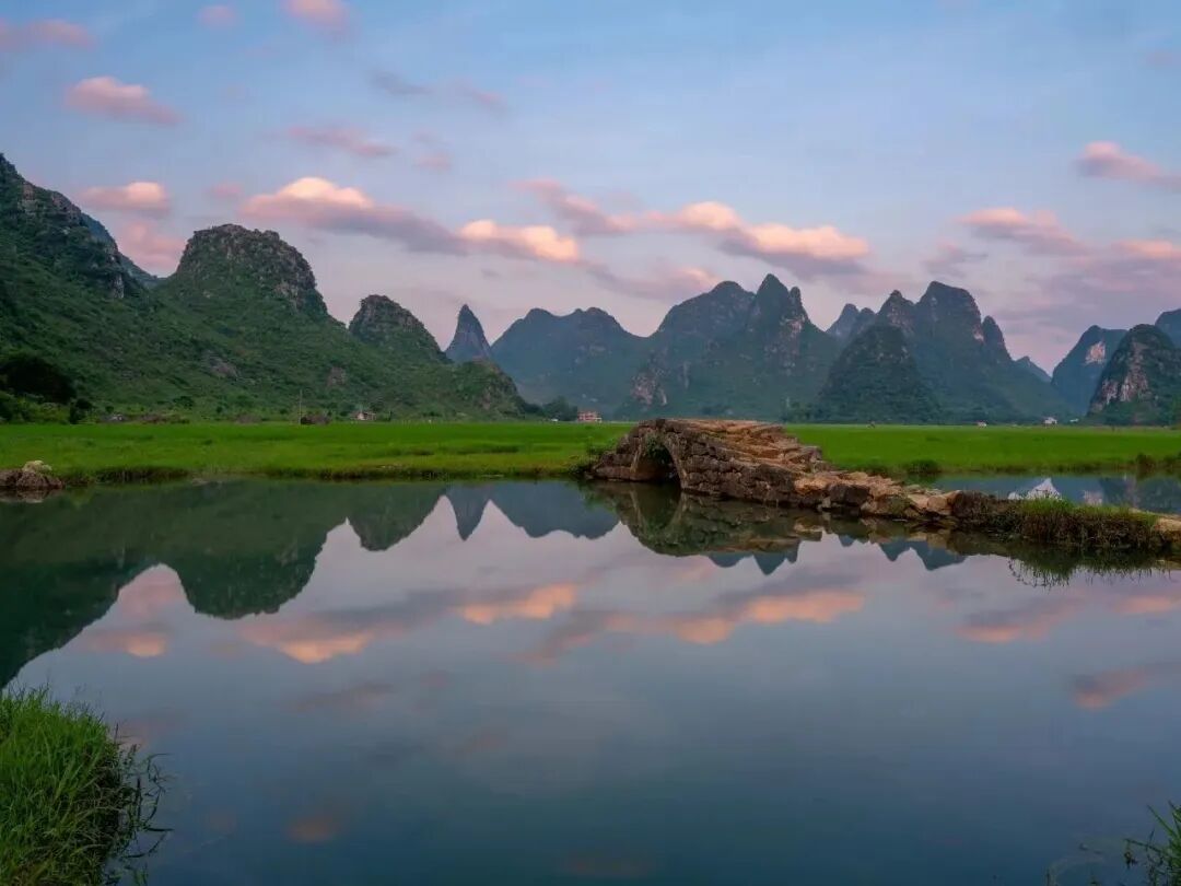 状元桥,是桂林的山水古桥,共有两座石桥,欣赏大自然鬼斧神工的杰作。田心村被群峰环抱,层峦叠嶂,田埂交错,百亩良田延绵无际,石桥青峰倒映在水中,清净幽远,远远望去,就像是一幅浓墨重彩的山水田园画卷。