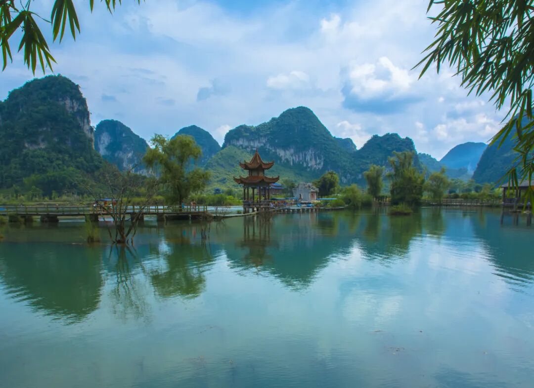 明仕田园,是广西最美的山水田园风光,素有“山水画廊”和“隐者之居”的美誉。喀斯特风貌的连绵俊峰,环绕着绿油油的山水稻田,山环水绕的田园风光极具诗情画意,犹如人间仙境!在乡野田间,周围有流水萦绕,静享田园美景,怡然自得。