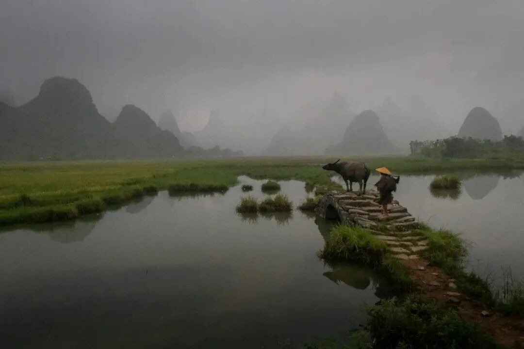 群峰耸立,溪水环绕,田陌俨然,大概是南方田园风光最真实的写照,广西山水深处的灵魂,就是悠然自得的田园生活和返璞归真的古典韵味。一派田园风光美如画卷,这是广西独有的田园诗意,沉浸在原汁原味的田园山水画卷中。