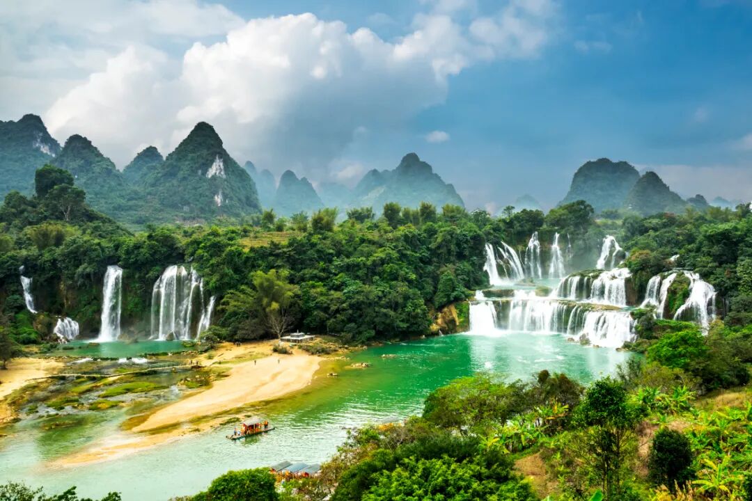 德天跨国瀑布,横跨中越两国,是亚洲第一、世界第四大跨国瀑布,瀑布水流量很大,声势浩大,近距离感受瀑布的魅力,十分震撼!乘坐竹筏在河中游,欣赏两岸的青山绿水,赏心悦目,惬意又自在。