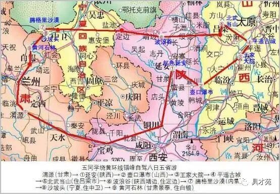 全程共行车2700多公里,由我和王钰轮换驾车。经过了陕西、山西、宁夏、内蒙和甘肃等三省二自治区,基本是在黄河中上游环线旅行。