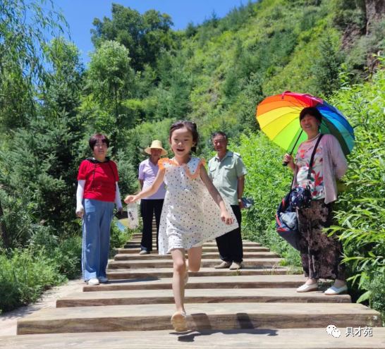渭河东源风景区,位于渭源县城南25公里,在天井峡后峡。这里植被优良,有绮丽的自然景观。进入峡谷,但见谷深坡陡,山峦叠嶂,一条小溪从山中倾泻而出,平添乐趣无限。大家先往后面深处走,孙女爱玩水,我和老婆陪着孙女在河里玩了一会。待和大家折返会齐,从一个“悬崖”处下去,路边喝茶凉亭比比皆是。稍往上走,到达了一个较大的瀑布前,流水清澈,哗哗作响,旁边赭红色的岩石上写着“渭河东源”四个大字。不禁感叹:千里渭水色黄黄,唯有源头水清清。折返下行,走着走着,眼前一座“鹊桥”架在小河之上,桥那边传来更大的流水声。寻声过去,一个水池里有个精致的雕塑,叫“香妃沐浴”,后边又是一个漂亮的瀑布。旁边有个两层凉亭,我和孙女上亭小憩,同伴们到附近的小景点拍照玩乐。再往下走,映入眼帘的,在“亲水步道”小木桥那边的一块草地上,一个个圆形的茅草屋,毗邻而居。走近察看,这些“茅草屋"个个客满,看来这里老板夏天的经营效益还是不错的。
