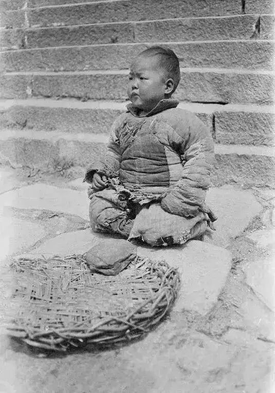 ▼1919年的山东泰山,一位穿着破旧的小孩跪在路边,明显是在乞讨,可怜的孩子没有人管。