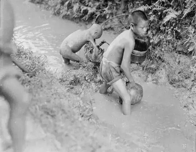 ▼1917年,西安,一群小孩在小溪里捕鱼,经常下河捞鱼的他们是抓鱼的老手,还经常在河里游泳。
