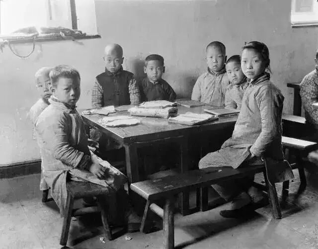 ▼1918年的一间私塾,孩子们围在一起上课,摄影师走进来手中的相机吸引孩子们的注意力,此时留下了照片。