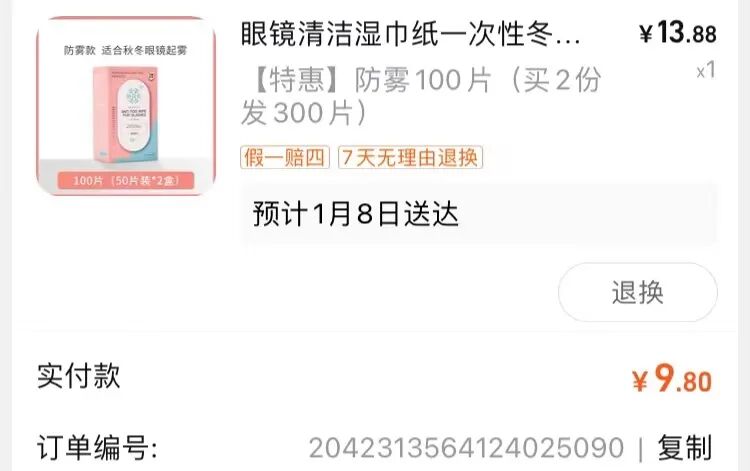 我出门时用防雾眼镜湿巾擦了擦镜片,冬天骑电动车戴口罩镜片上全是雾气,啥也看不见,也是听网友们的推荐去淘宝买了这种防雾擦镜湿巾,使用效果怎么说呢,确实有效果但有限,刚擦完还行,过一会儿还是会起雾,没那么严重,比不擦好些。