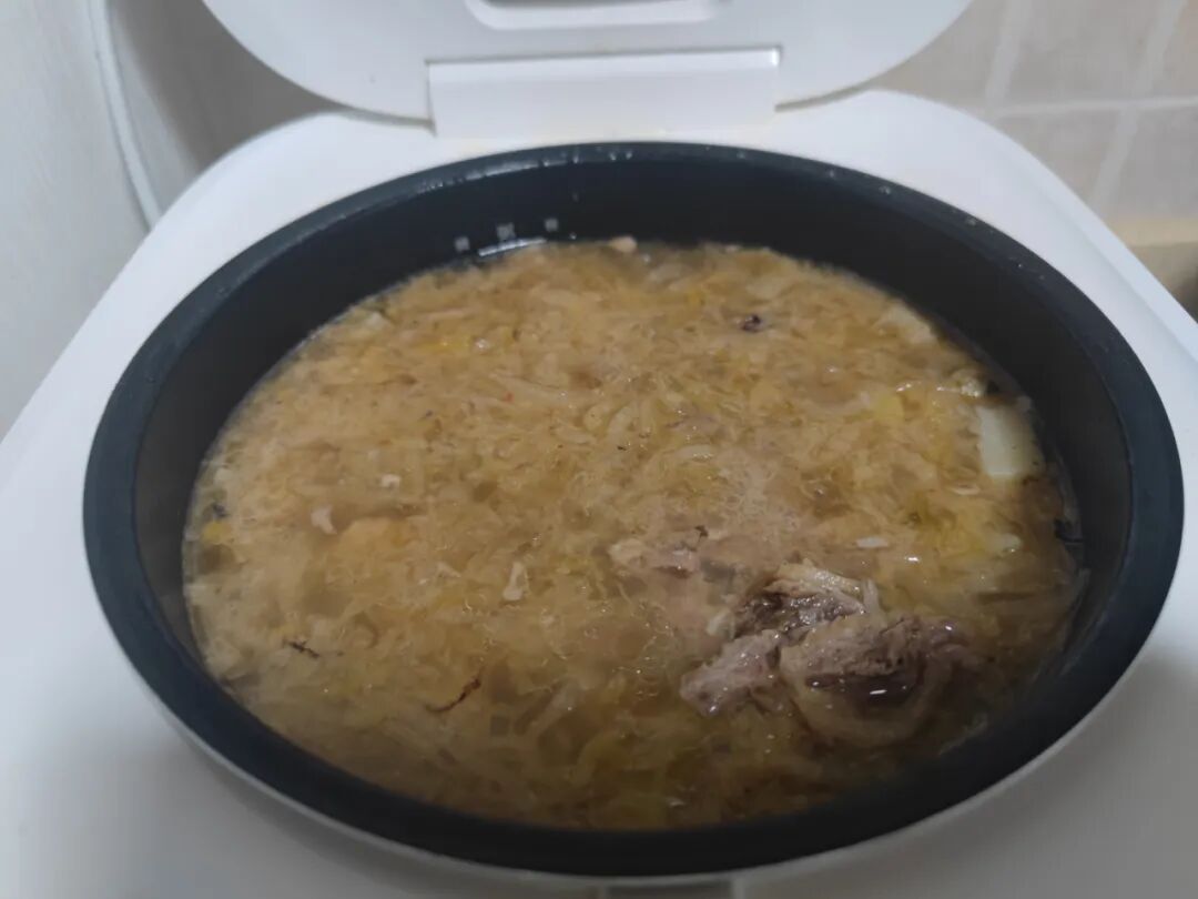 中午儿子吃完后,我又把剩下的和骨头一起放在电饭煲里炖。