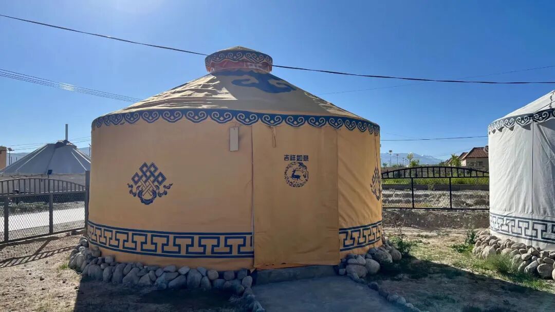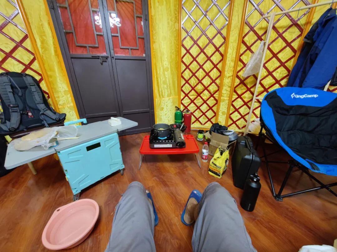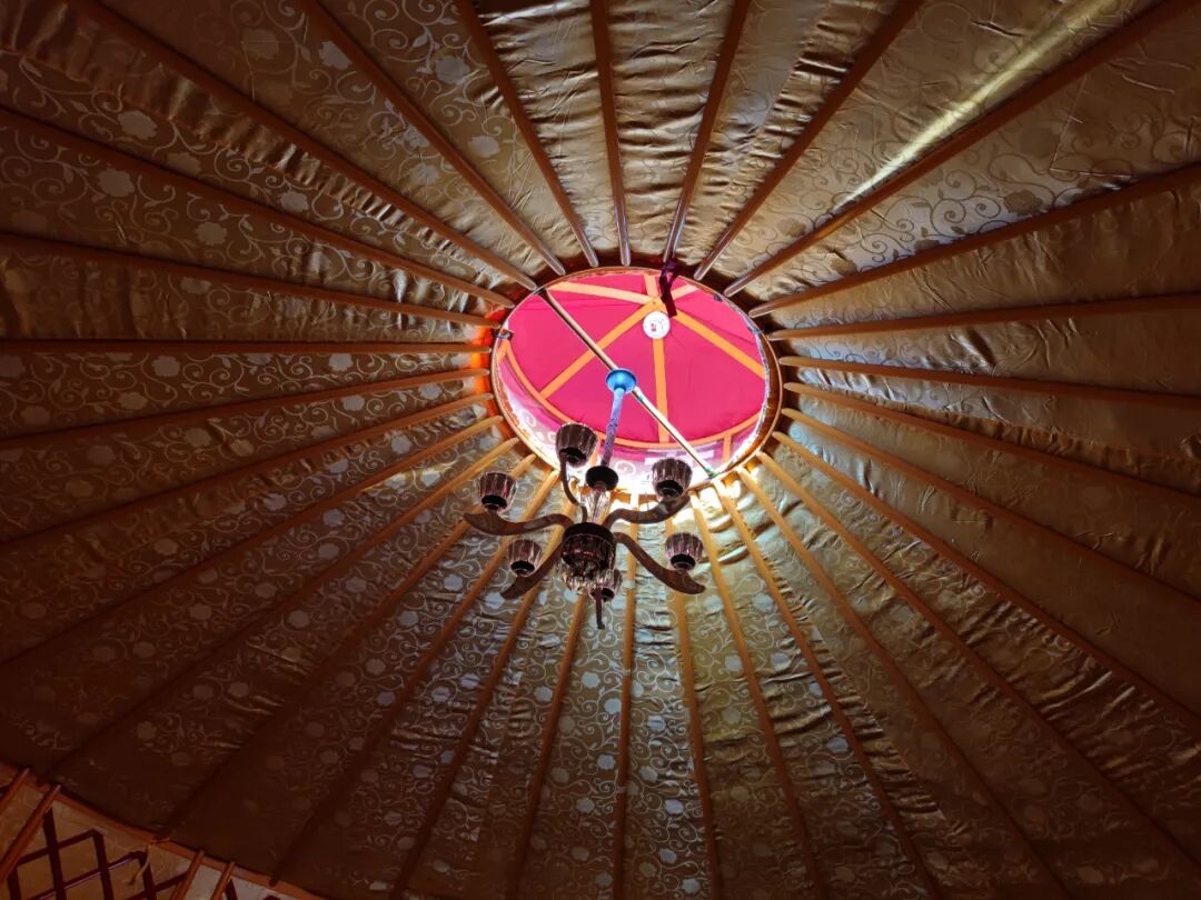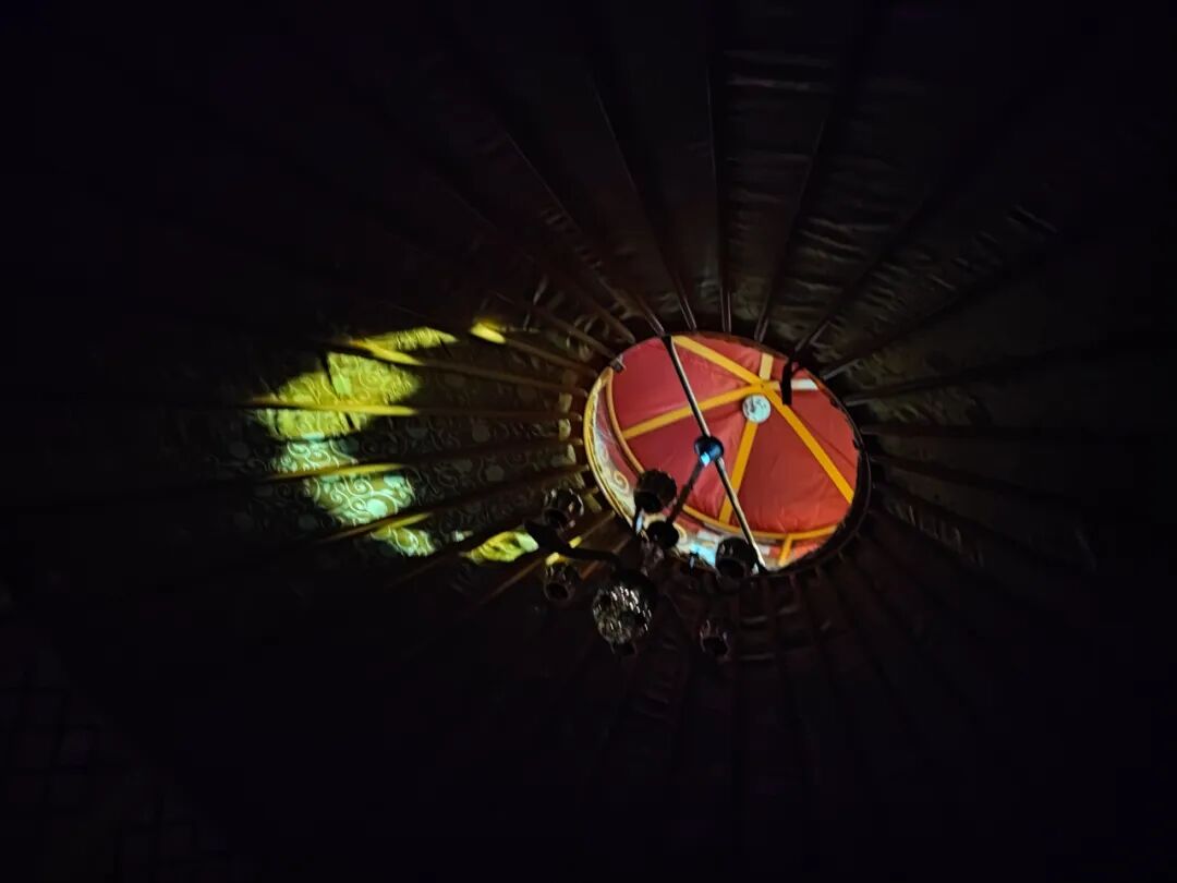 夜里醒来,蒙古包里漆黑一片,外面的灯光透过包顶照进来。